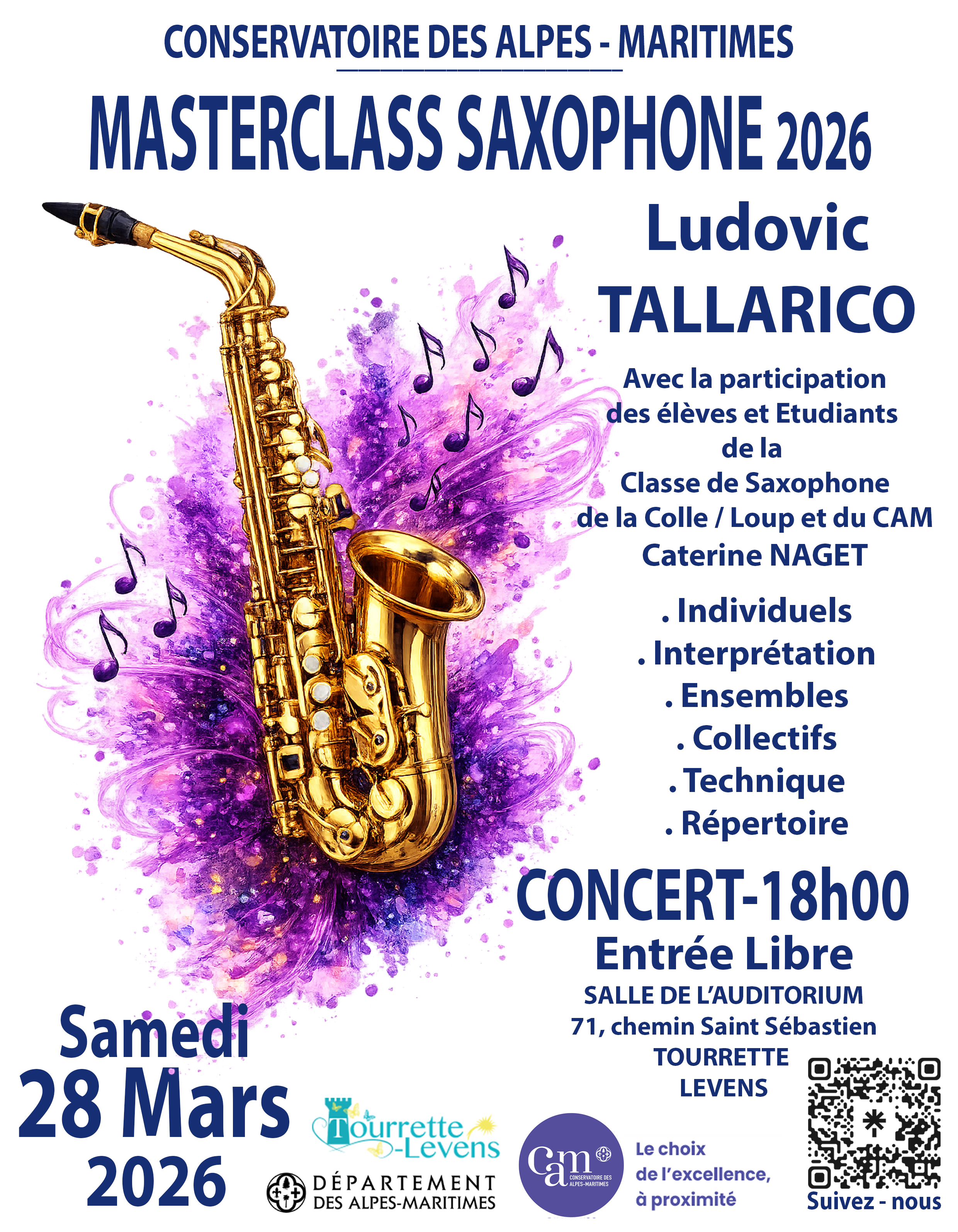 Le 28 mars prochain, la salle du CAM de Tourrette-Levens (Auditorium) accueillera une masterclass de Saxophone destinée aux élèves souhaitant approfondir leur pratique instrumentale et développer leur expérience musicale en ensemble.